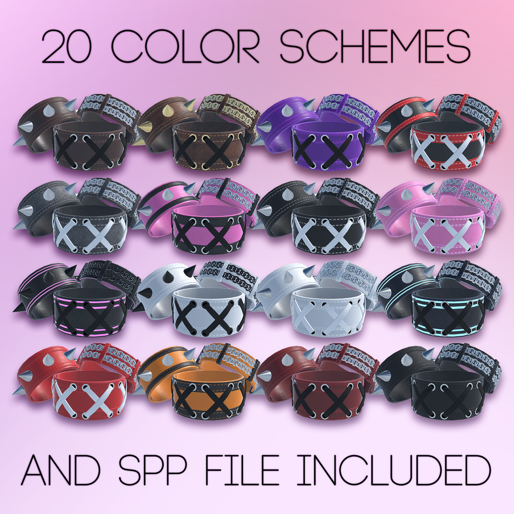 Big pack of leather and metal bracelets to use on your VRChat avatars. Can also be used as chockers.